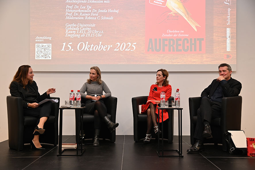 Diesen Themen widmete sich dann auch die Podiumsdiskussion am 15. Oktober 2025 mit der Autorin Lea Ypi, Dr. Jonela Hoxhaj (Honorarkonsulin der Republik Albanien) und Prof. Dr. Rainer Forst (Goethe-Universität / Normative Orders), die vom Forschungszentrum „Normative Orders“ gemeinsam mit „FrauenmitFormat“, dem Honorarkonsulat der Republik Albanien in Frankfurt am Main, dem Suhrkamp-Verlag und der Johanna Quandt Young Academy ausgerichtet und von Rebecca C. Schmidt moderiert wurde.