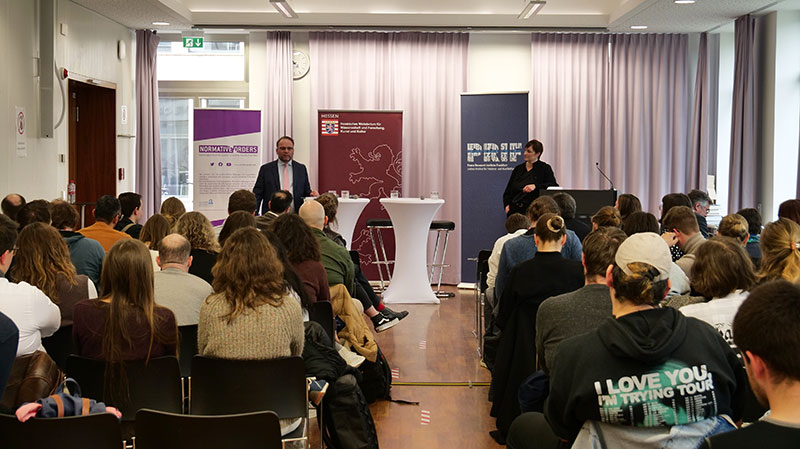 Eingeleitet wurde die Veranstaltung von drei kurzen Impulsen zu den vielfältigen Projekten, die sich mit diesen Forschungsfragen am Forschungszentrum „Normative Ordnungen“,  dem Peace Research Institute Frankfurt (PRIF), dem Forschungsinstitut Gesellschaftlicher Zusammenhalt (FGZ)  und am Fachbereich Gesellschaftwissenschaften der Goethe-Universität befassen. Für die Institutionen sprachen stellvertretend Prof. Dr. Nicole Deitelhoff, Prof. Dr. Rainer Forst und Prof. Dr. Christopher Daase.