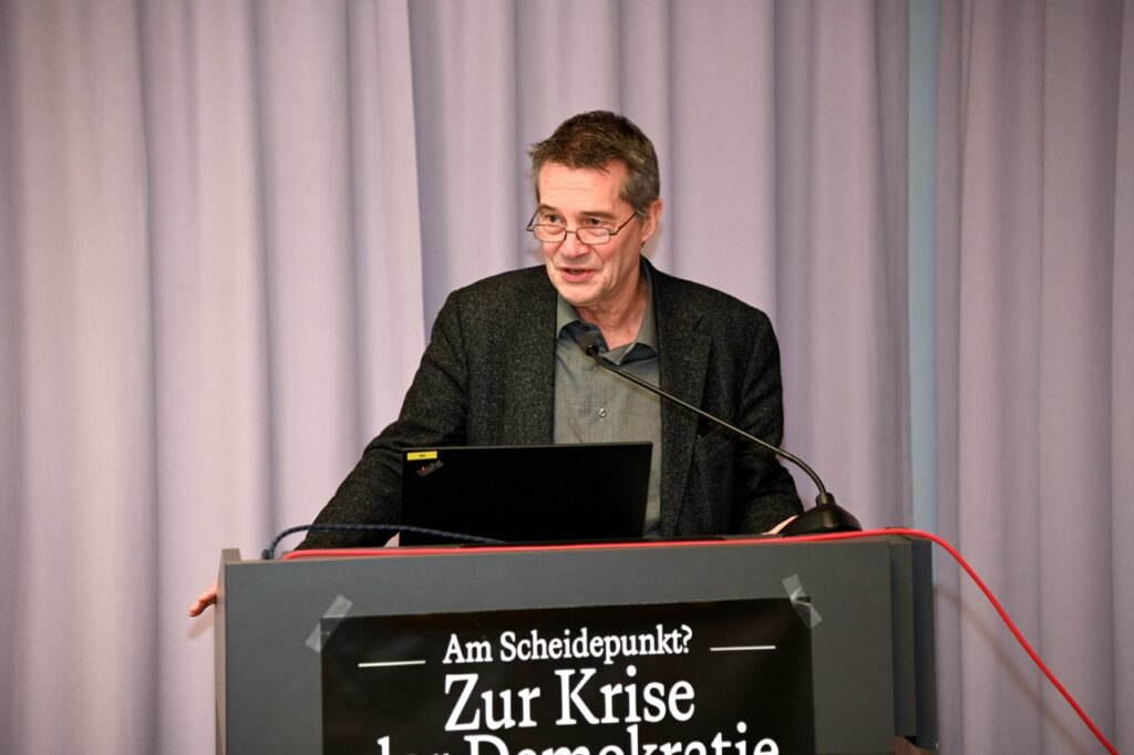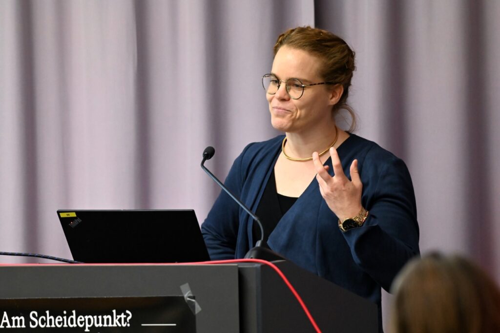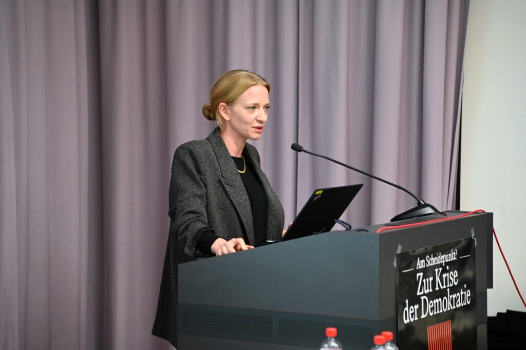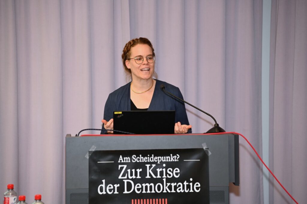 Am 26. November 2025 eröffnete Jenny Brichzin die Ringvorlesung „Am Scheidepunkt? Zur Zukunft der Demokratietheorie“. In ihrem Vortrag „Krise der Demokratietheorie? Eine soziologische Intervention“ diagnostizierte die Soziologin zuerst das Fehlen von Konzepten des Zusammenlebens in demokratietheoretischen Arbeiten. Demokratie präge aber gesellschaftliche Ordnung und brauche deshalb eine gesellschaftstheoretische Fundierung. Wenn die Krisendiagnosen der Demokratie unter diesem Gesichtspunkt analysiert werden, werden sowohl normative als auch institutionell-praktische Perspektiven auf die Krise(n) deutlich.