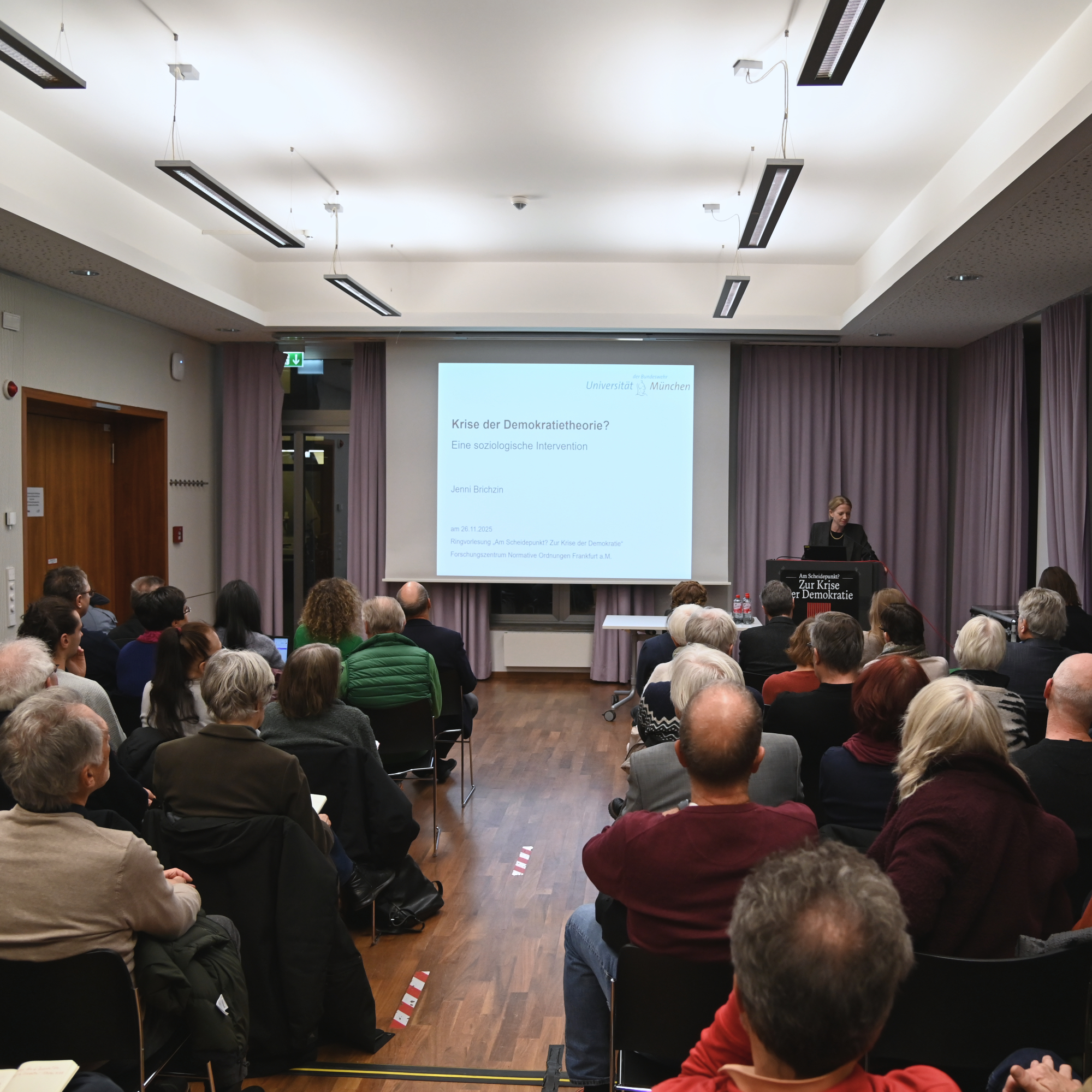 Am 26. November 2025 eröffnete Jenny Brichzin die Ringvorlesung „Am Scheidepunkt? Zur Zukunft der Demokratietheorie“. In ihrem Vortrag „Krise der Demokratietheorie? Eine soziologische Intervention“ diagnostizierte die Soziologin zuerst das Fehlen von Konzepten des Zusammenlebens in demokratietheoretischen Arbeiten. Demokratie präge aber gesellschaftliche Ordnung und brauche deshalb eine gesellschaftstheoretische Fundierung. Wenn die Krisendiagnosen der Demokratie unter diesem Gesichtspunkt analysiert werden, werden sowohl normative als auch institutionell-praktische Perspektiven auf die Krise(n) deutlich.