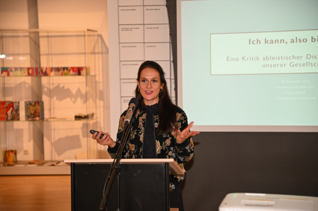 Regina Schidel hat im Rahmen der Goethe Lectures Offenbach eine Kritik ableistischer Diskriminierung unserer Gesellschaft präsentiert.