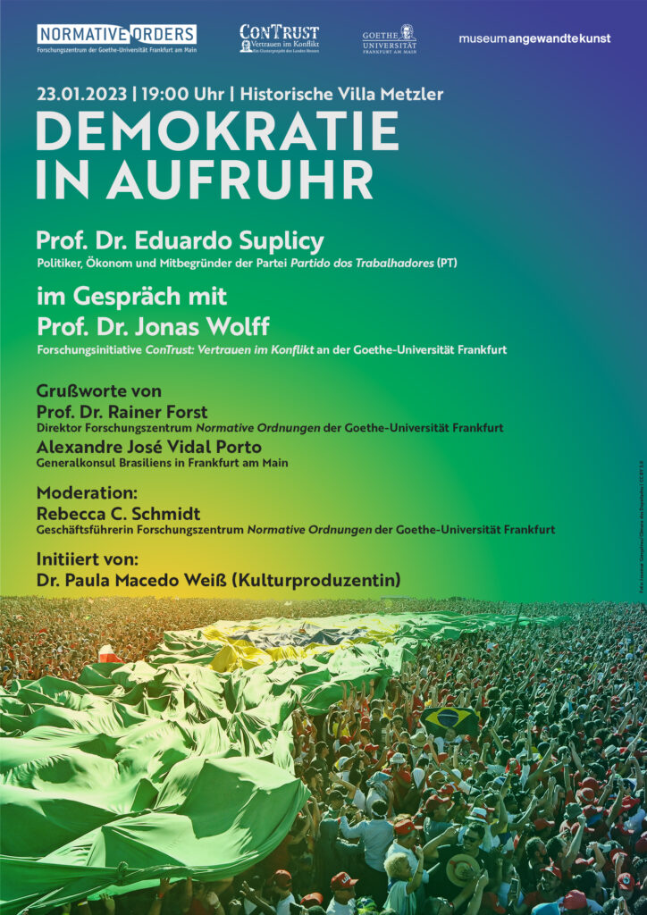 Zu Gast sind der brasilianische Politiker und Ökonom Prof. Eduardo Suplicy – seit mehr als 40 Jahren eine der prägendsten Figuren der brasilianischen Politik  – und Prof. Jonas Wolff, Professor für Politikwissenschaft mit dem Schwerpunkt Transformationsforschung in Lateinamerika der Goethe-Universität Frankfurt, Assoziiertes Mitglied der Forschungsinitiative ConTrust am Forschungszentrum Normative Ordnungen und Mitglied des Peace Research Institute Frankfurt (PRIF). Moderieren wird Rebecca Caroline Schmidt (Geschäftsführerin Forschungszentrum Normative Ordnungen der Goethe-Universität Frankfurt). Grußworte sprechen der Direktor des Forschungszentrums Normative Ordnungen Prof. Rainer Forst und der Generalkonsul Brasiliens in Frankfurt am Main Alexandre José Vidal Porto. Initiiert wurde die Veranstaltung von Dr. Paula Macedo Weiss (Kulturproduzentin). Der Eintritt ist frei. Eine Anmeldung ist nicht erforderlich.