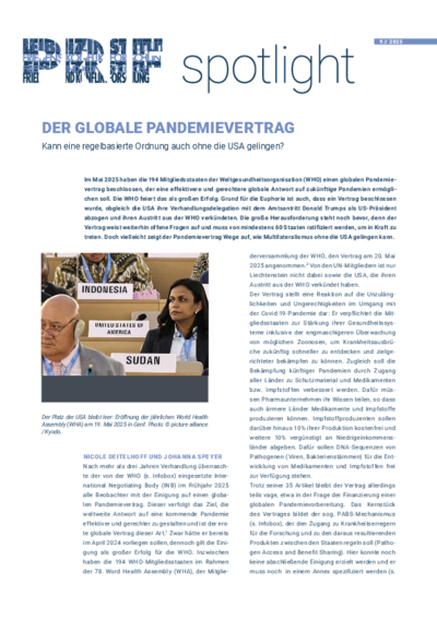Im Mai 2025 haben die 194 Mitgliedsstaaten der Weltgesundheitsorganisation (WHO) einen globalen Pandemievertrag beschlossen, der eine effektivere und gerechtere globale Antwort auf zukünftige Pandemien ermöglichen soll. Die WHO feiert das als großen Erfolg. Grund für die Euphorie ist auch, dass ein Vertrag beschlossen wurde, obgleich die USA ihre Verhandlungsdelegation mit dem Amtsantritt Donald Trumps als US-Präsident abzogen und ihren Austritt aus der WHO verkündeten. Die große Herausforderung steht noch bevor, denn der Vertrag weist weiterhin offene Fragen auf und muss von mindestens 60 Staaten ratifiziert werden, um in Kraft zu treten. Doch vielleicht zeigt der Pandemievertrag Wege auf, wie Multilateralismus ohne die USA gelingen kann.