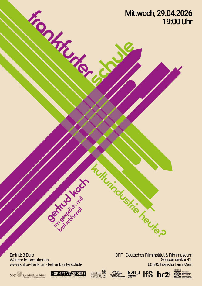 Das Gespräch „Kulturindustrie heute?“ widmet sich der Aktualität und Tragfähigkeit eines zentralen Begriffs der Kritischen Theorie. Die Filmwissenschaftlerin Gertrud Koch diskutiert im Gespräch mit dem Filmkritiker Bert Rebhandl die gegenwärtigen Formen kultureller Produktion und Verbreitung vor dem Hintergrund von Digitalisierung, Plattformen und globalen Medienmärkten. Ausgehend von den klassischen Analysen Adornos und Horkheimers wird gefragt, inwiefern sich die damalige Kritik an der Kulturindustrie auf heutige Film-, Medien- und Popkulturen anwenden lässt oder neu gedacht werden muss. Dabei spielt der Film eine wichtige Rolle: Am Film und seinen Produktions- und Vermarktungsformen lässt sich gut nachvollziehen, wie sich Kunst, Wirtschaft und Öffentlichkeit heute gegenseitig beeinflussen. Im Mittelpunkt stehen Fragen nach Gestaltung, politischer Wirkung, wirtschaftlichen Bedingungen sowie nach Unabhängigkeit, Urheberschaft, Kritikfähigkeit und Öffentlichkeit. Das Gespräch ist Teil der Reihe „Frankfurter Schule“, die vom Forschungszentrum Normative Ordnungen der Goethe-Universität, dem Dezernat Kultur und Wissenschaft der Stadt Frankfurt am Main und dem Hessischen Ministerium für Wissenschaft und Forschung, Kunst und Kultur veranstaltet wird.