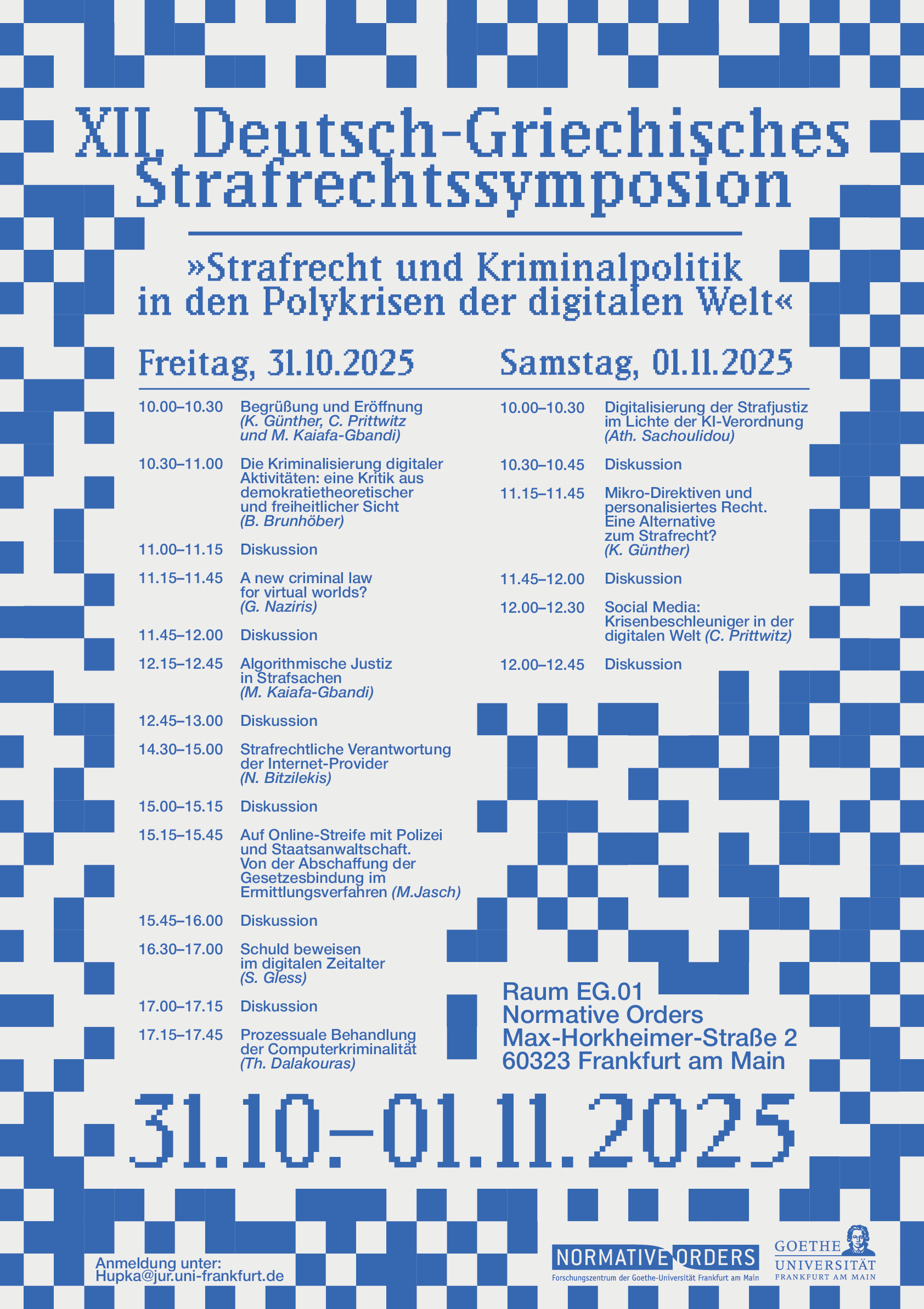 Am 31. Oktober und 1. November 2025 findet in Frankfurt am Main zum zwölften Mal das 1983 von Günter Bemmann (FernUniversität Hagen) und Ioannis Manoledakis (Aristoteles Universität Thessaloniki) begründete und von Maria Kaiafa-Gbandi (Aristoteles Universität Thessaloniki) und Cornelius Prittwitz (zunächst Universität Rostock, seit 2000 Goethe-Universität Frankfurt am Main) fortgeführte Deutsch-Griechische Strafrechtssymposion statt.